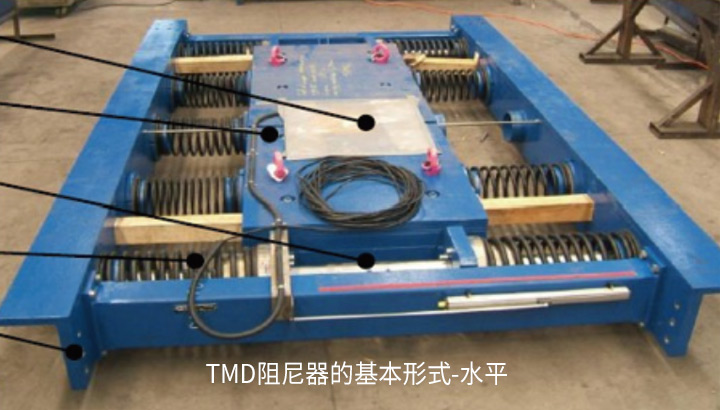 電梯調(diào)頻質(zhì)量阻尼器系統(tǒng),簡稱TMD,由固體質(zhì)量、彈簧、阻尼桿組成,它將阻尼器系統(tǒng)自身的振動頻率調(diào)整到結構振動的主要頻率附近,通過TMD與主結構間的相互作用,可實現(xiàn)能量從主結構向TMD系統(tǒng)的轉(zhuǎn)移,并消耗能量,達到減小主結構振動,提高舒適性的目的。
