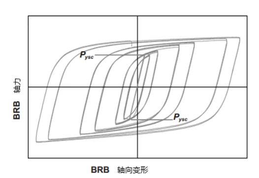 受壓及受拉BRB屈服時,BRBF表現(xiàn)出延性滯回形態(tài),能量耗散明顯。典型的力-變形行為在圖2中顯示,滯回行為和應(yīng)變強化效果很明顯。BRB展示各向同性和隨動強化的復(fù)合效果,因為Poisson膨脹以及在核芯和約束機制結(jié)合處的摩擦,典型行為受壓比受拉強度高一點。在AISC抗震規(guī)范中,BRB循環(huán)行為包括應(yīng)變強化,用受壓強度調(diào)整系數(shù)β及應(yīng)變強化調(diào)整系數(shù)ω來量化。