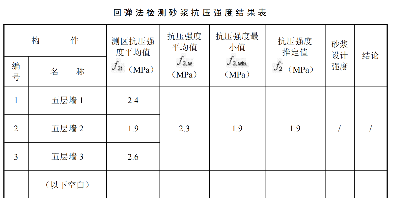 采用砂漿回彈儀依據(jù)《砌體工程現(xiàn)場(chǎng)檢測(cè)技術(shù)標(biāo)準(zhǔn)》GB/T 50315-2011 采用砂漿回 彈儀對(duì)該工程墻體的砌筑砂漿進(jìn)行檢測(cè)。檢測(cè)結(jié)果表明:該工程所測(cè)承重墻體的砂漿抗壓強(qiáng)度推定值為 1.9MPa。具體檢測(cè) 數(shù)據(jù)詳見報(bào)告附表 11.2。