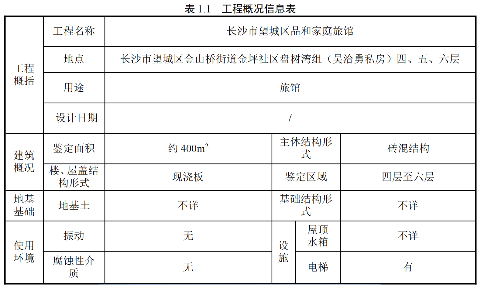 長(zhǎng)沙市望城區(qū)品和家庭旅館位于長(zhǎng)沙市望城區(qū)金山橋街道金坪社區(qū)盤樹灣組(吳洽 勇私房)四、五、六層,該房屋鑒定區(qū)域?yàn)樗膶又亮鶎?,鑒定面積約為 400m2,該工程 主體結(jié)構(gòu)以 240mm 厚磚墻、混凝土梁、現(xiàn)澆板等構(gòu)件共同承重。該工程外觀照如下圖 1-1 所示。經(jīng)現(xiàn)場(chǎng)勘查確認(rèn)該工程的概況信息如下表 1.1 所示